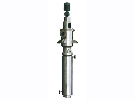 預熱到設(shè)定溫度的物料自攪拌薄膜蒸發(fā)器上部進料口進入蒸發(fā)器,經(jīng)轉(zhuǎn)軸中部的布料盤通過離心力均布在圓筒內(nèi)壁上。再通過刮板的攪拌,驅(qū)動,分散在蒸發(fā)圓筒加熱內(nèi)壁上形成均勻液膜。液膜吸收夾套中加熱介質(zhì)(回執(zhí)蒸汽或?qū)嵊停┕┙o蒸發(fā)表面(圓筒內(nèi)壁)的熱量,在其表面進行物質(zhì)的蒸發(fā),膜層受熱蒸發(fā)后會減薄。后進入的料液又被后繼而來的刮板掃刮,形成新膜,再蒸發(fā),如此反復進行。料液漸被濃縮,再由出料口排出。蒸發(fā)出來的蒸汽,經(jīng)除沫器,出二次蒸汽出口排出。